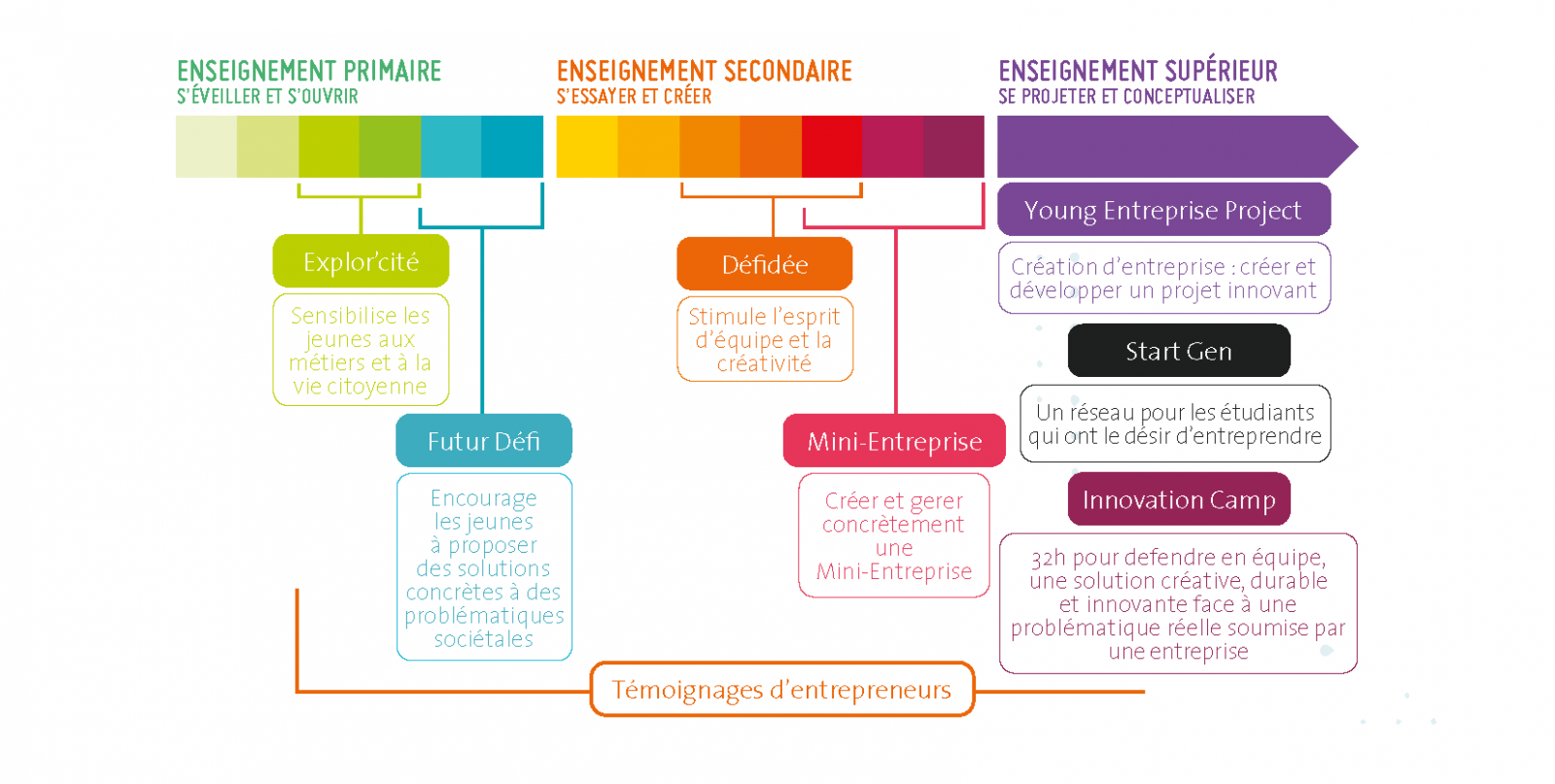 Pour que ces apprentissages soient durables, LJE considère qu’une approche des notions entrepreneuriales doit être proposée dès le plus jeune âge et poursuivie tout au long de leur scolarité. Cela commence dès l’école primaire pour se poursuivre jusqu'à la création de sa propre Start'Up.